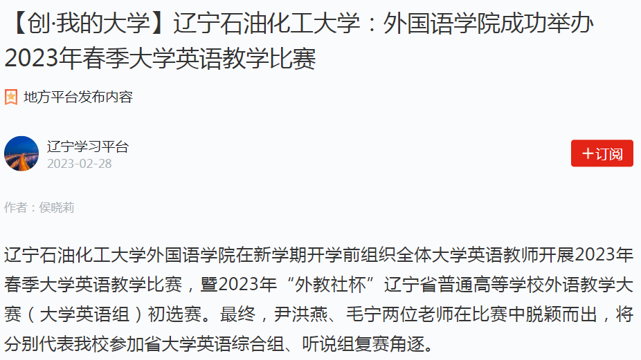 编者按:近日,学习强国辽宁学习平台、辽宁日报·北国号、人民日报客户端·人民号等媒体平台对我校外国语学院在新学期开学前组织全体大学英语教师开展2023年春季大学英语教学比赛,暨2023年“外教社杯”辽宁省普通高等学校外语教学大赛(大学英语组)初选赛进行了宣传报道。现将相关报道转载如下: