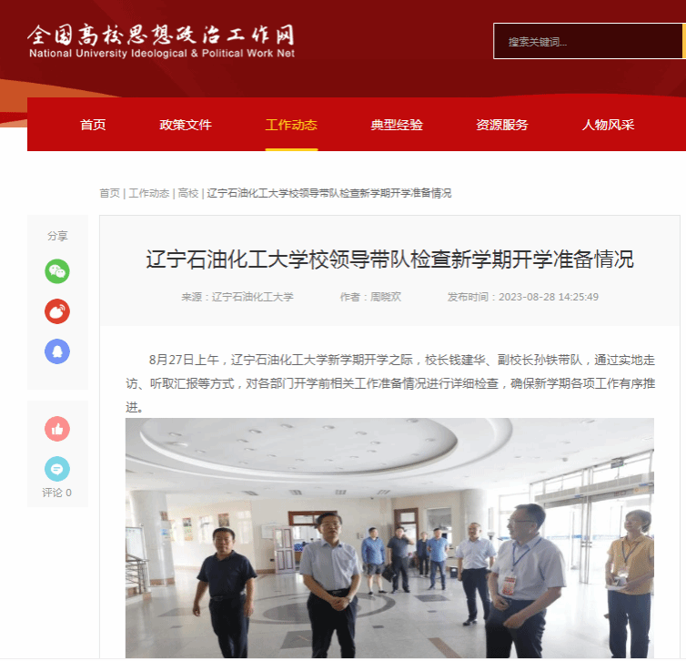 编者按:8月28日,全国高校思想政治工作网、辽宁日报·北国号、人民日报客户端·人民号等媒体平台对我校新学期开学之际,校长钱建华、副校长孙铁带队,通过实地走访、听取汇报等方式,对各部门开学前相关工作准备情况进行详细检查,确保新学期各项工作有序推进进行了宣传报道。现将相关报道转载如下: