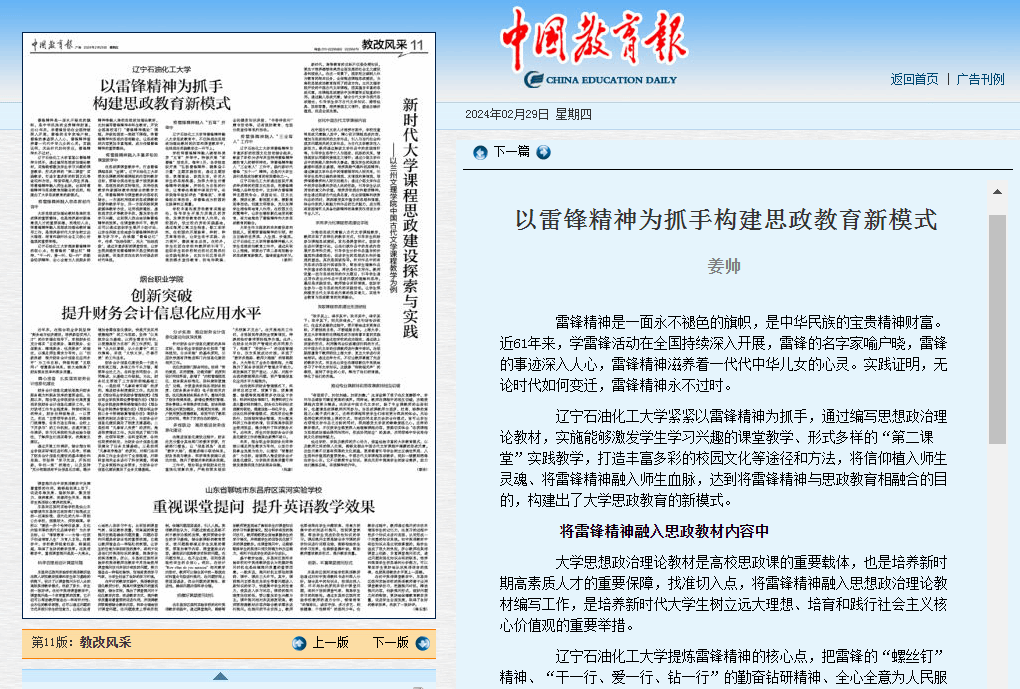 编者按:2月29日,中国教育报第11版教改风采登载了我校石油天然气工程学院副书记姜帅撰写的文章《国产亚洲综合一区二区三区_亚洲欧美日韩中文天堂_尤物在线观看视频不卡无码_国产最新精品亚洲2025不卡_亚洲成Av人在线观看片水蜜桃以雷锋精神为抓手构建思政教育新模式》。现将相关报道转载如下: