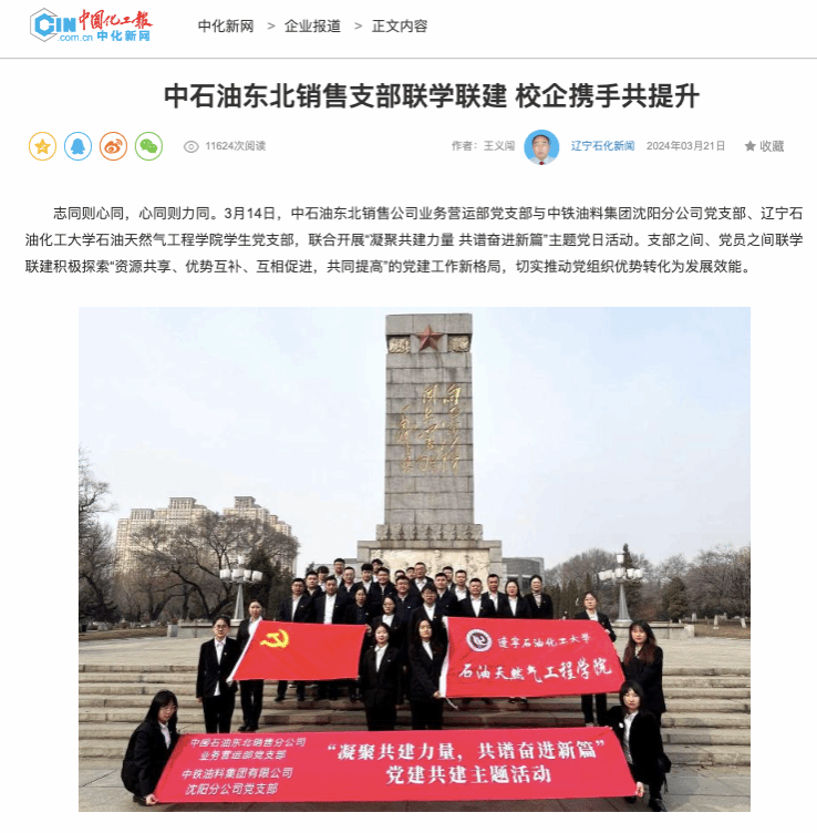 编者按:为弘扬雷锋精神,传承红色基因,深化校企合作,3月14日,石油天然气工程学院学生党支部联合中国石油东北销售分公司业务营运部党支部和中铁油料集团有限公司沈阳分公司党支部,共同开展了校企党建共建党日活动。中国化工报对此进行了报道,现将相关内容转载如下: