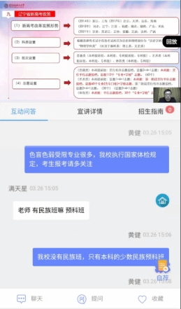 为进一步推动学校本科招生宣传工作,吸引更多优质考生报考我校,助力广大考生深入了解辽宁省新高考招生政策,满足广大考生及家长咨询需求,3月26日下午,我校依托“高招通”直播平台开展了2022年本科招生线上宣讲会。此次宣讲由学校招生科科长黄健担任宣讲主播,直播持续近1个小时左右,累计观看量达1700余人次,吸引了广大考生及家长的观看,取得了良好的宣传效果。